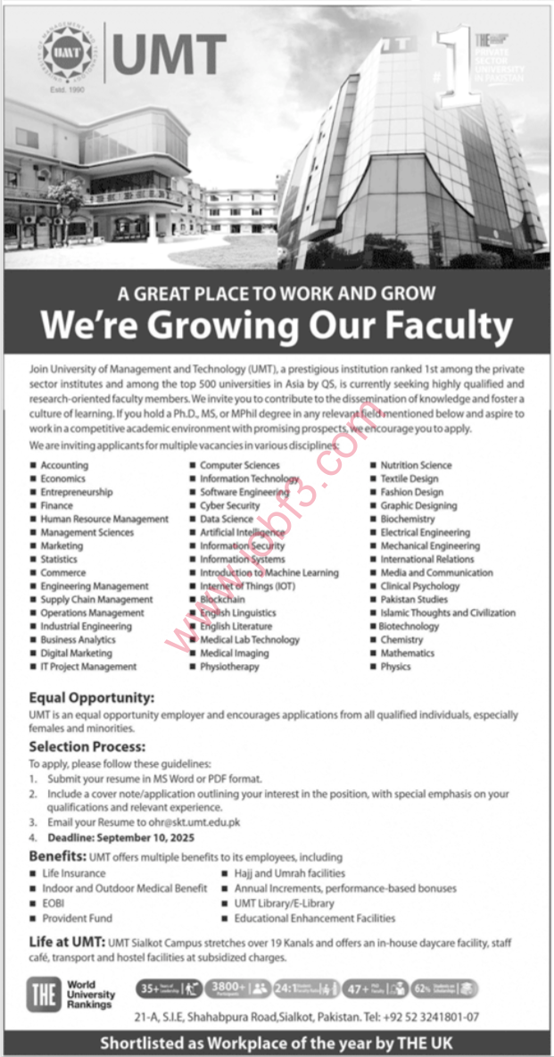 The University of Management and Technology (UMT) is one of the top universities in Pakistan. It is known for offering quality education and supporting students and staff in every way. The Sialkot campus is growing fast and looking for smart, hard-working people to join their team.