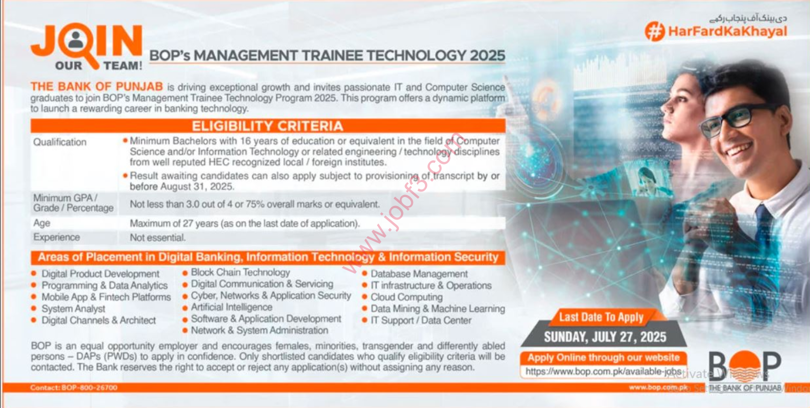 Are you looking for govt jobs 2025 or want to start a career in banking and technology? Good news! The Bank of Punjab (BOP) is now offering Management Trainee Technology jobs in Khanewal. These new jobs 2025 are great for fresh graduates or young professionals who want to join the banking sector and work with modern technology.