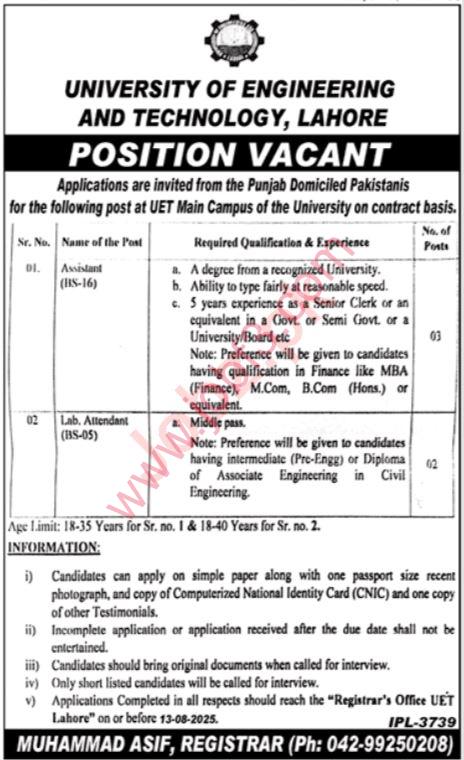 Here are some of the top positions available in the University of Engineering and Technology Lahore Jobs 2025: