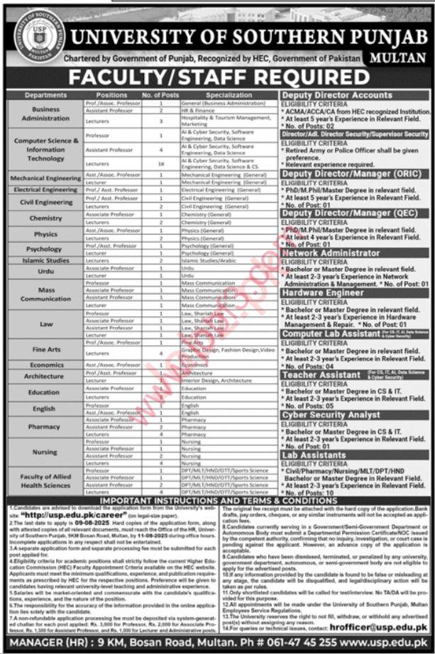 USP has announced several new govt jobs 2025 in different departments. These jobs are full-time and based in Multan. Below is a list of the available positions: